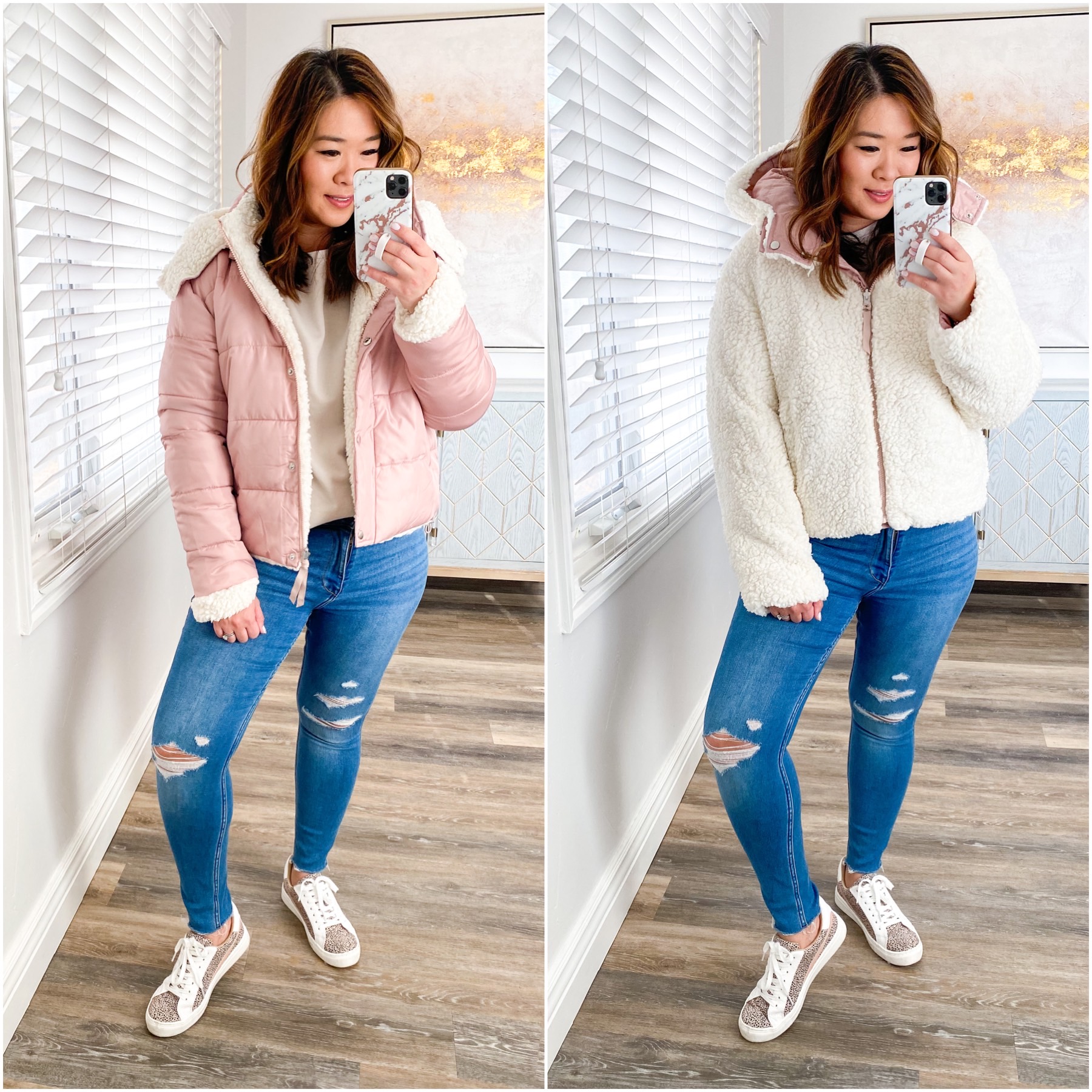 Left Outfit: Sweater (M) // Jacket (M – Reversible side on the right) // Jeans (6) // Shoes (TTS)